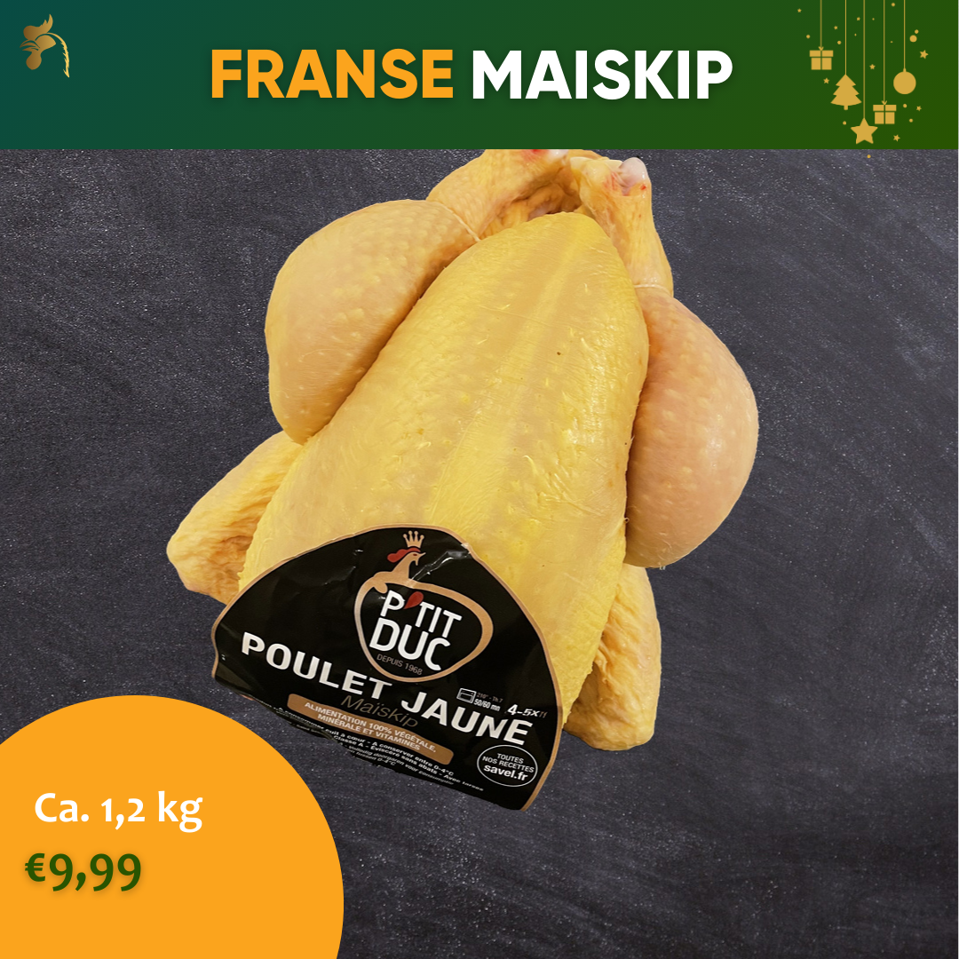 Deze Franse kippen krijgen extra maïs gevoerd waardoor ze de gele kleur krijgen en extra smaakvol zijn. Doordat het voer van de kippen voor een groot deel uit maïs bestaat, bouwen de kippen meer vet op. Dit draagt bij aan meer smaak waardoor de kippen uitstekend geschikt zijn om te grillen of om in de oven te bereiden. De maïskip weegt ca. 1,2 kg. en wordt diepgevroren geleverd.