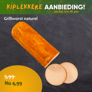 Ambachtelijk bereide grillworst met een heerlijke smaak. Lekker voor op brood of om uit te delen op een verjaardag. De kipgrillworst weegt ca. 330 gr.